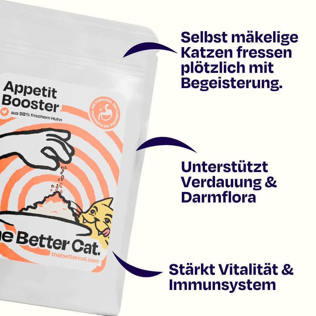 Deine Katze ist "süchtig" nach Supermarkt-Futter mit künstlichen Aromen? Mit dem Appetit Booster gelingt der Wechsel auf natürliche, artgerechte Nahrung – ohne Frust und Futterstreik.