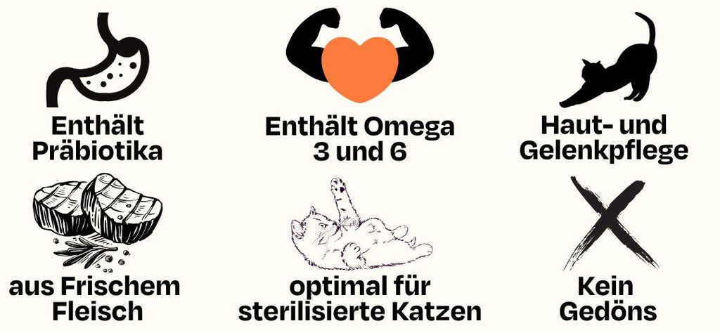 Frisches Fleisch passt besser zum kurzen Verdauungssystem einer Fleischfresser-Katze. Mögliche Vorteile sind eine geregelte Verdauung sowie gesündere Zähne und Zahnfleisch. Da Protein die Hauptenergiequelle deiner Katze sein sollte, sorgt frisches Fleisch für genug Power für ein gesundes Leben deines Haustieres. Es gibt deiner Katze, was sie verdient und befriedigt ihre natürlichen Bedürfnisse.