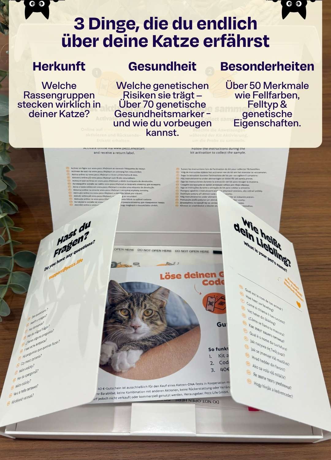 So viel erfährst du sonst nie über deine Katze: Herkunft, Merkmale, Risiken, 70+ Gesundheitsmarker – alles in einem 32-seitigen DNA-Report.