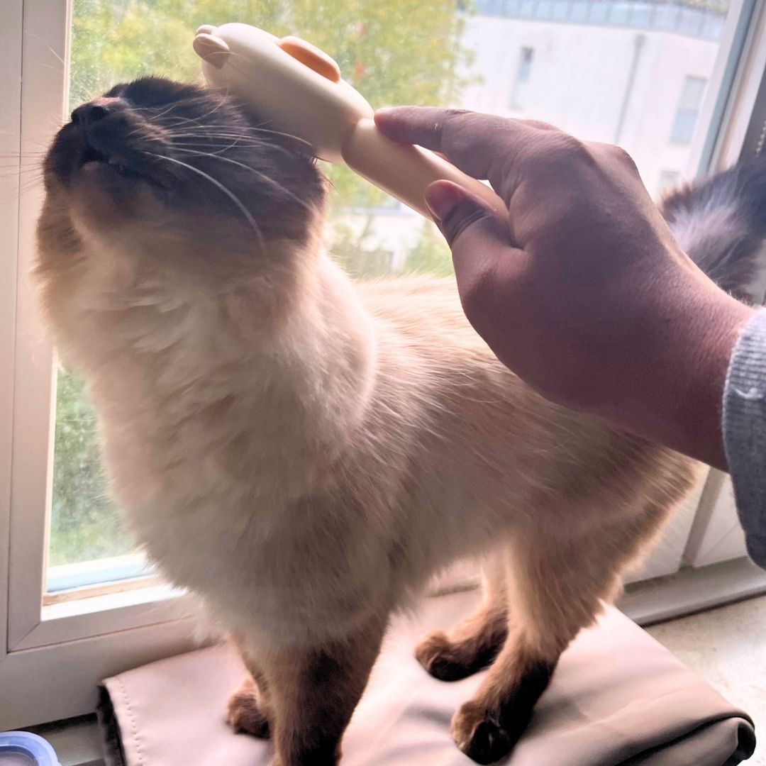Ganz gleich, welche Art von Fell deine Katze hat, unsere ergonomische Katzenbürste ist dafür geeignet. Sie entfernt effektiv lose, verfilzte Haare sowie Schuppen und Schmutz, die sich im Katzenfell verbergen. Die Kammnadel verfügt über ein 140°-Bogen-Design, das tief ins Fell eindringen kann und verhindert, dass Haare herumfliegen.