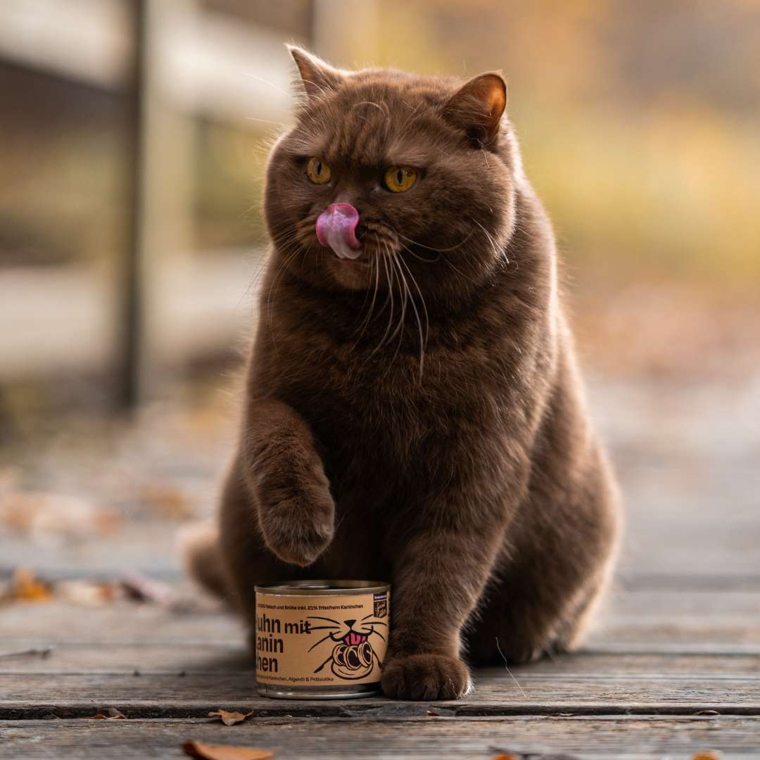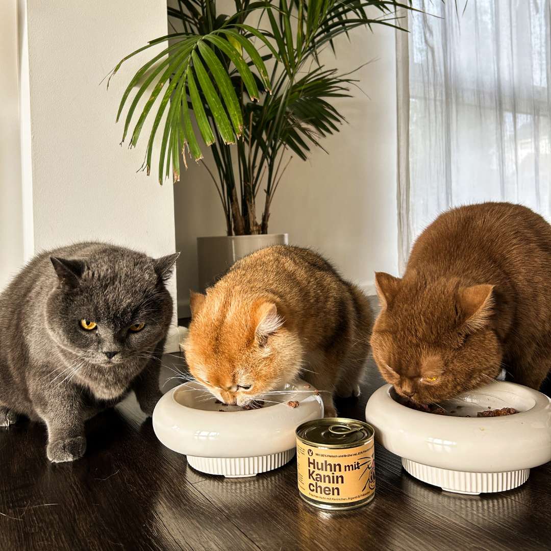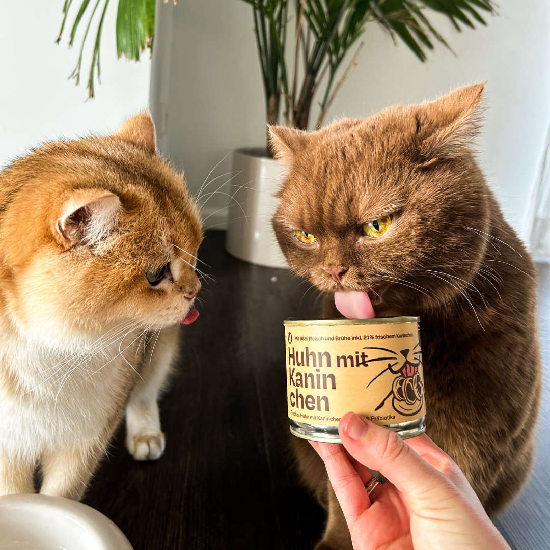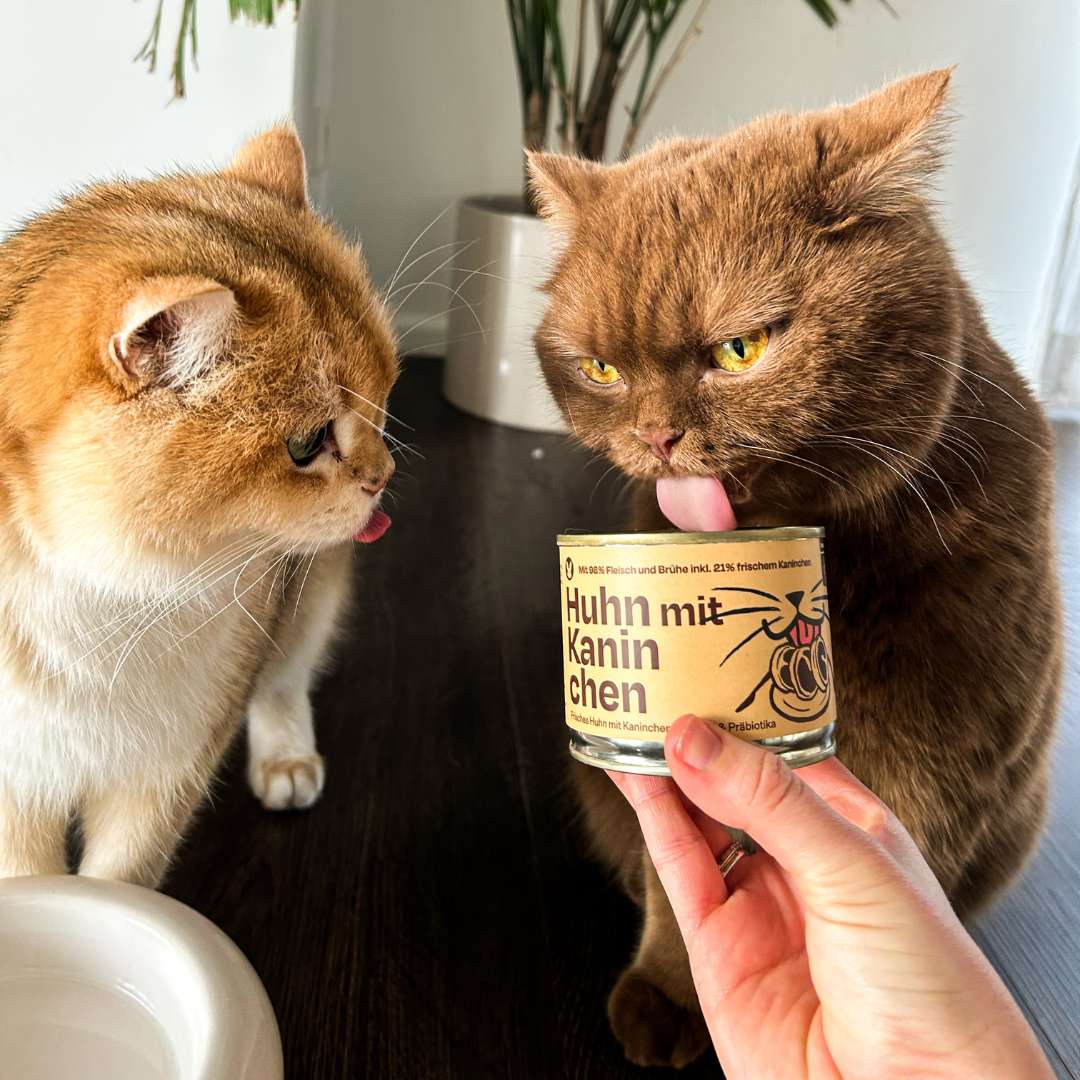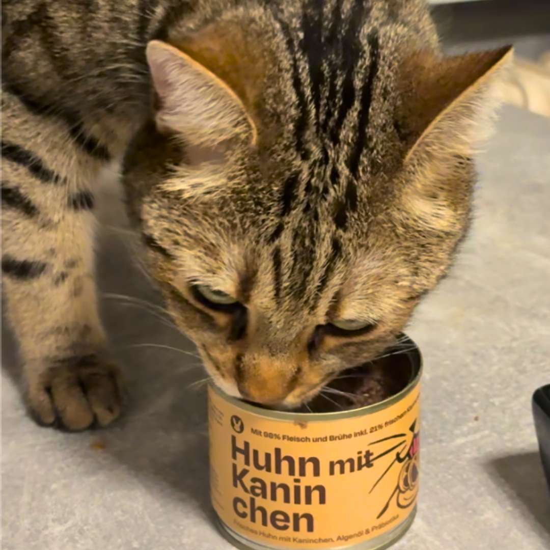 Was als kleine Idee begann, wurde zu einer echten Herzenssorte: Huhn mit Kaninchen – inspiriert von Sinas empfindlichem Gourmet Hugo. Gemeinsam haben wir eine Rezeptur entwickelt, die selbst skeptische Katzen überzeugt und gleichzeitig den Darm stärkt.